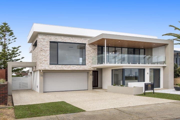 This home’s focus is on open plan living with large stacker doors that open to the balcony, complete with glass balustrading. The house also features kitchens on both ground and first floors for dual living. Adding to the contemporary look and feel of the home is louvre screens to the South West elevation of the outdoor living & entertaining area.