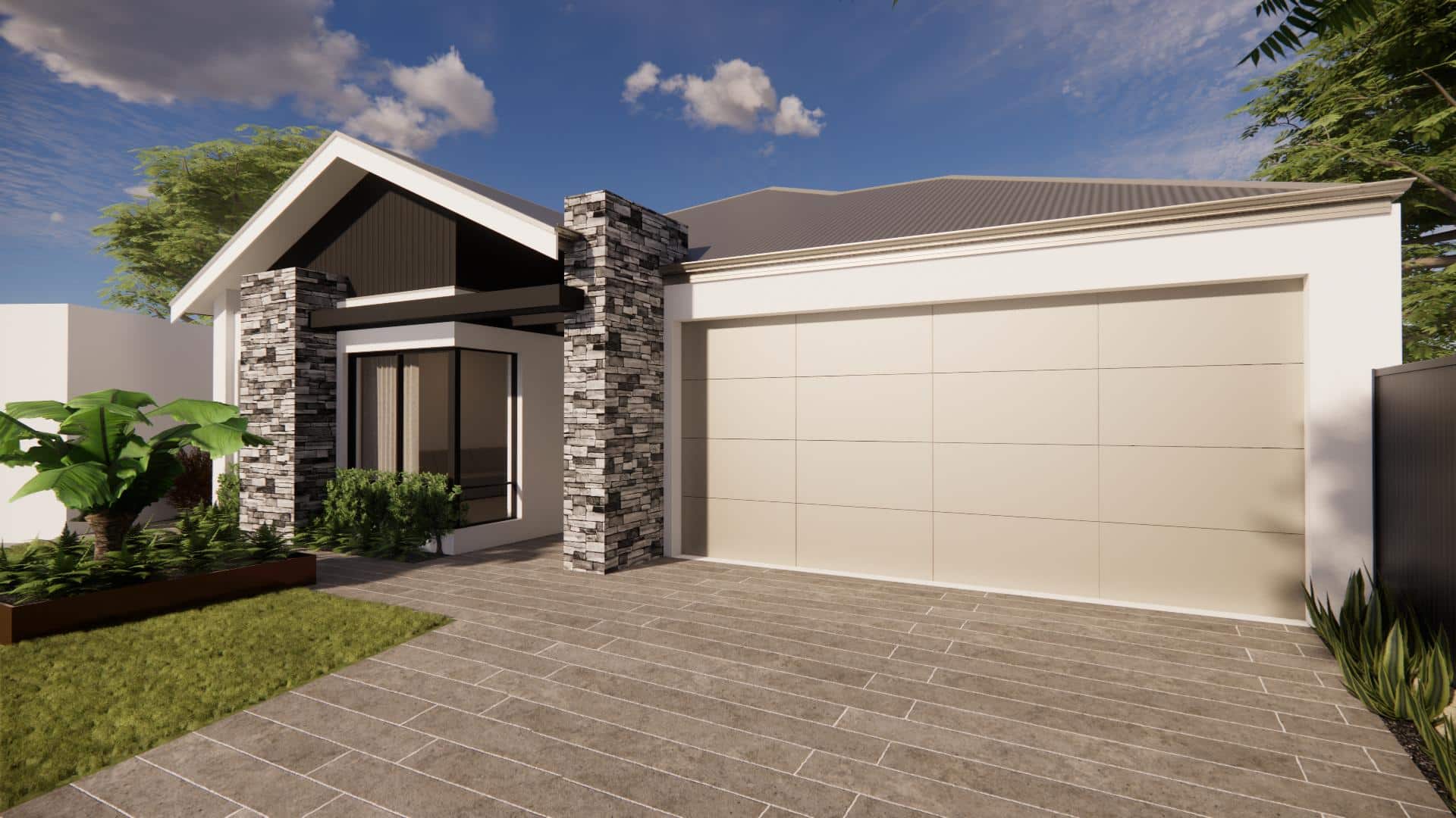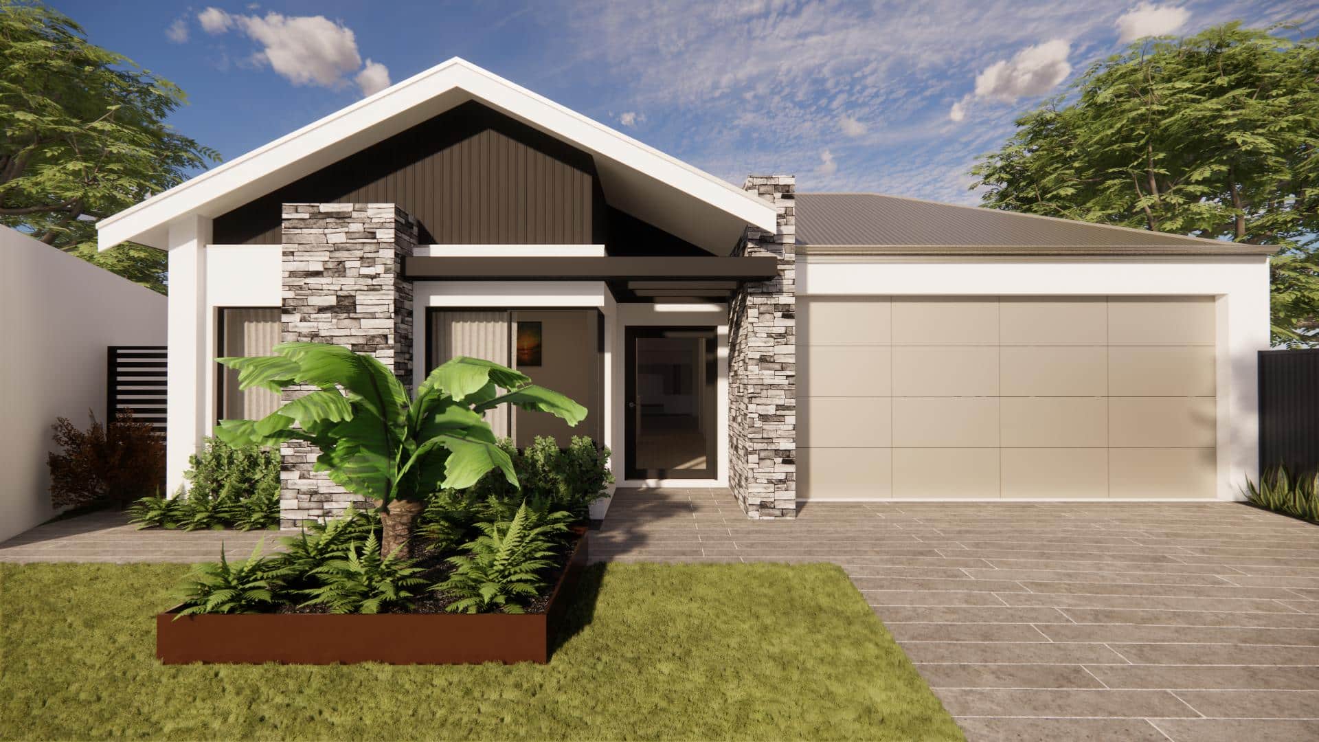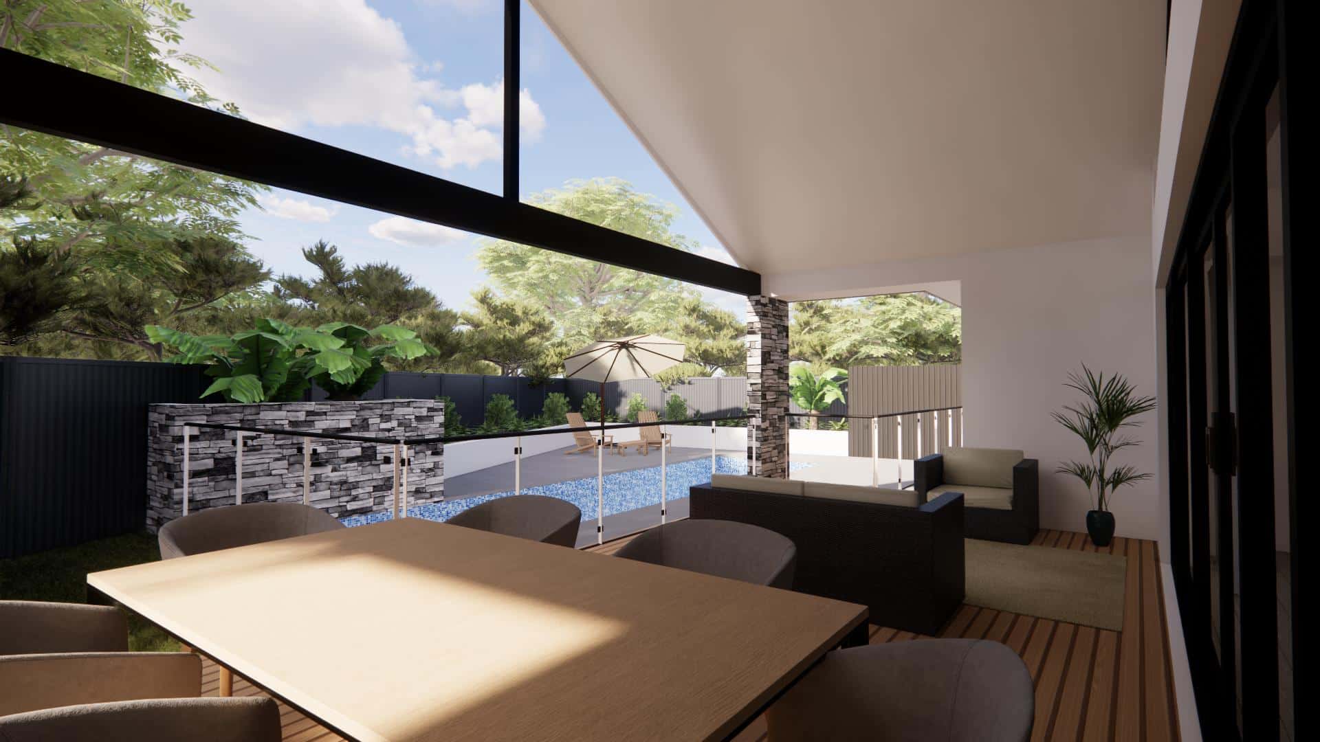 Among its many highlights is a concrete lap pool, adorned by an astounding water feature. We’ve integrated feature stone elements both in the front of the home and in the pool area. The living area boasts a raking ceiling that seamlessly extends to a glass-enclosed alfresco, while honed concrete characterizes the external hardscape areas. For the culinary enthusiast, the kitchen houses a spacious scullery. Complementing these luxurious amenities is a sizable master bedroom with a grand dresser, ready to delight the new homeowners.