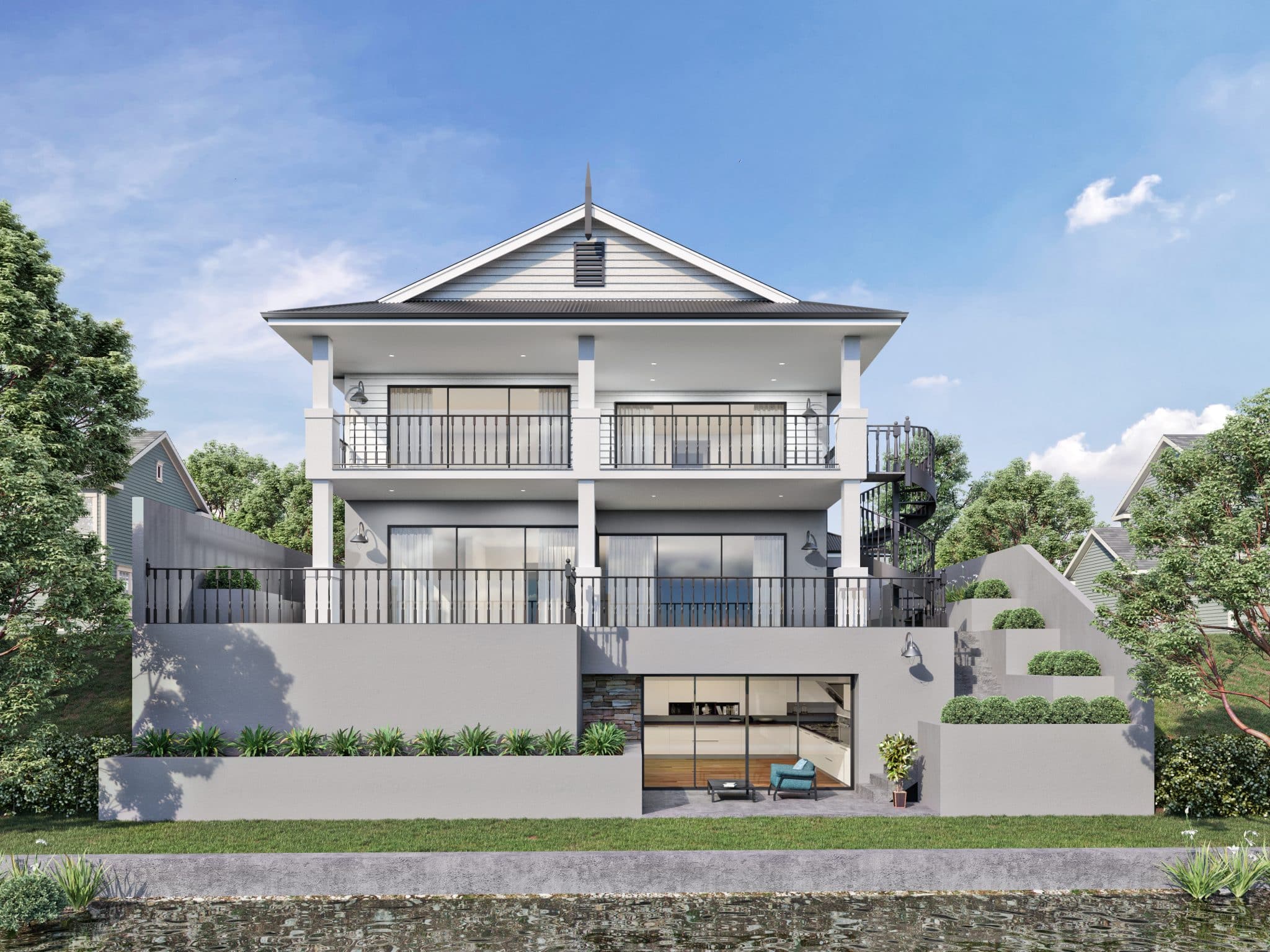 The architecture fully captures the exclusive look with its large under-croft, and an external spiral staircase, while situating it on canals to enhance its size. Within, it has oak timber flooring throughout, with a large kitchen and scullery. Other luxurious features have been included throughout, such as a custom steam shower in the ensuite and feature inbuilt glass cabinets in the kitchen.